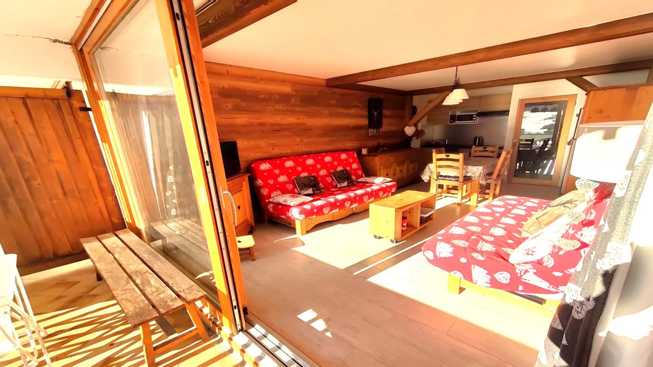 Il se compose d'une entrée avec un escalier,d'un coin cabine avec lit double, une salle d'eau comprenant une douche,un meuble vasque,un placard.Un WC séparé. Le séjour avec un canapés-lit deux places et un canapé classique,équipé d'une TV, la cuisine est équipée d'un réfrigérateur,un four,une hotte aspirante, bouilloire, micro-ondes, cafetière électrique Krups Dolce Gusto, plaque de cuisson à induction... Un agréable balcon exposée plein SUD, pour profiter d'un repas ou d'un moment détente au soleil. Un casier à ski. Un parking se situe au pied de la résidence.
