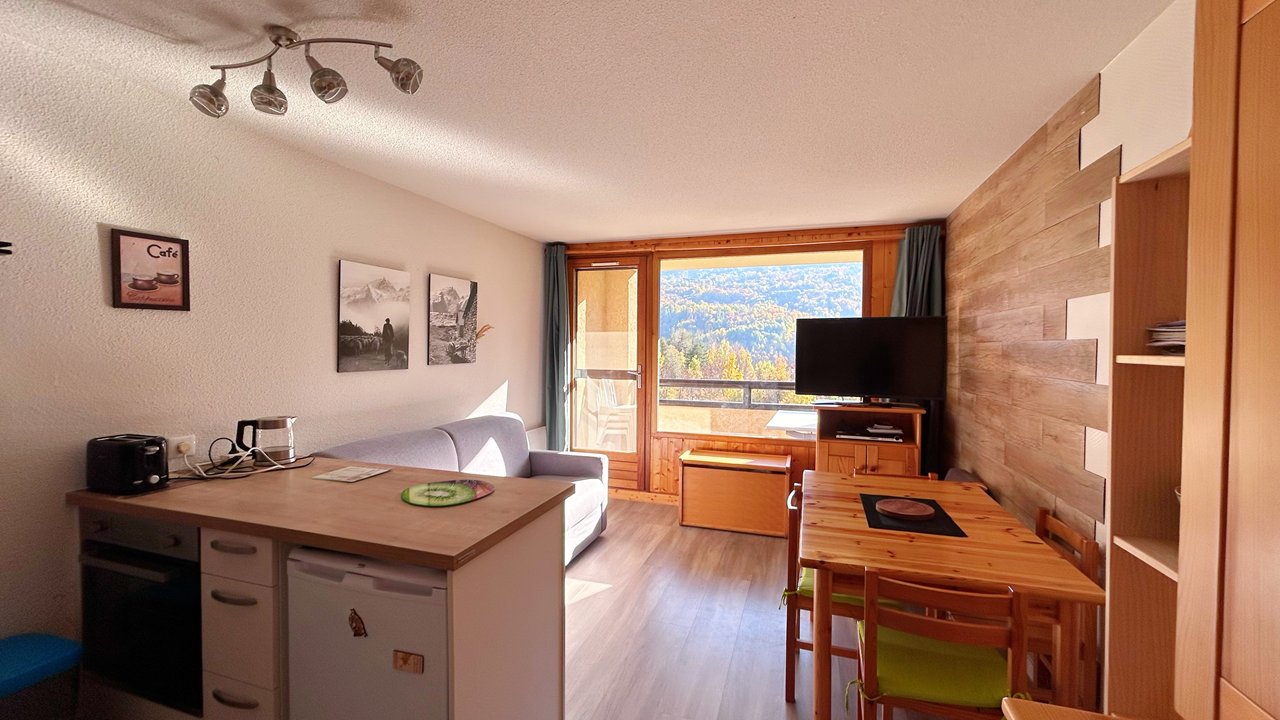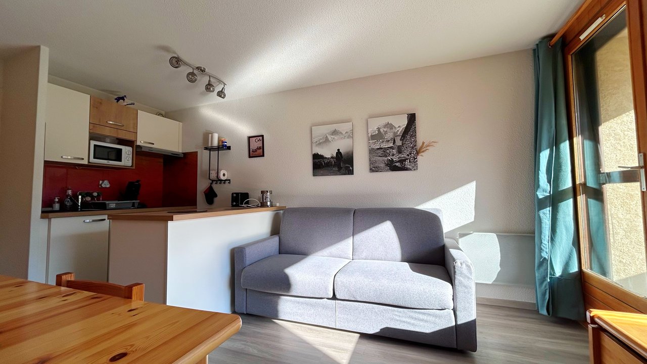 Appartement de montagne, 4 adultes et 2 enfants. Il se compose d'une entrée avec un grand placard, une chambre avec un lit double (140x200), d'un coin montagne avec un lit superposé séparé par un rideau( 90x200), une salle de bain avec grande douche et une machine à laver, un WC séparé. Le séjour avec un canapé clic clac deux places (140x200), la cuisine est équipée d'un réfrigérateur, four , micro-ondes, plaque vitro-céramique, lave-vaisselle... Un agréable balcon exposée plein SUD, pour profitez d'un repas ou d'un moment détente au soleil. Un parking se situe face à la résidence.