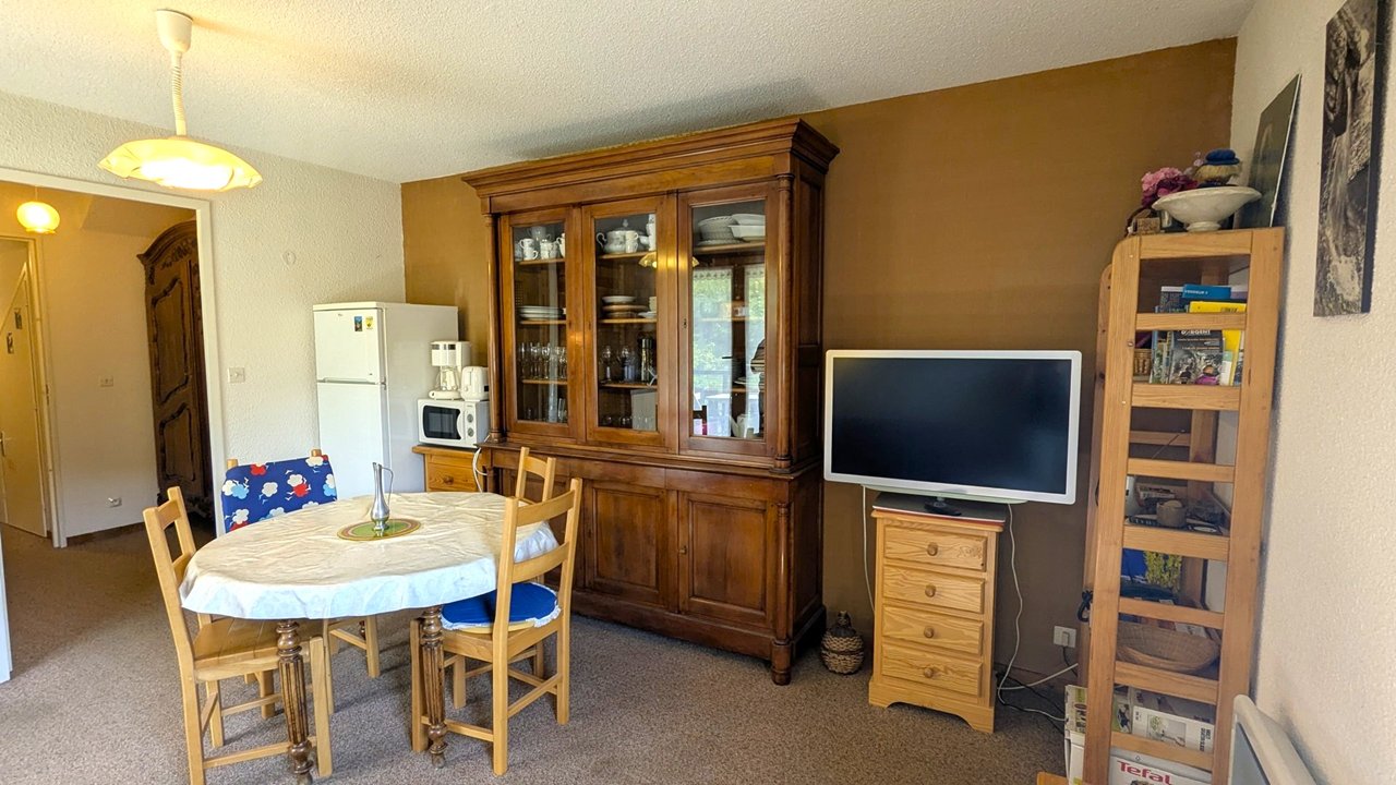 Le séjour avec un canapé-lit: 1 lit double 140x200, la cuisine est équipée d'un réfrigérateur avec freezer, four, cafetière à filtre, plaques électriques, lave-vaisselle, micro-onde...), dans le séjour une porte fenêtre qui donne accès à un balcon terrasse pour profiter d'un repas ou d'un moment détente au soleil exposition Sud-Ouest.