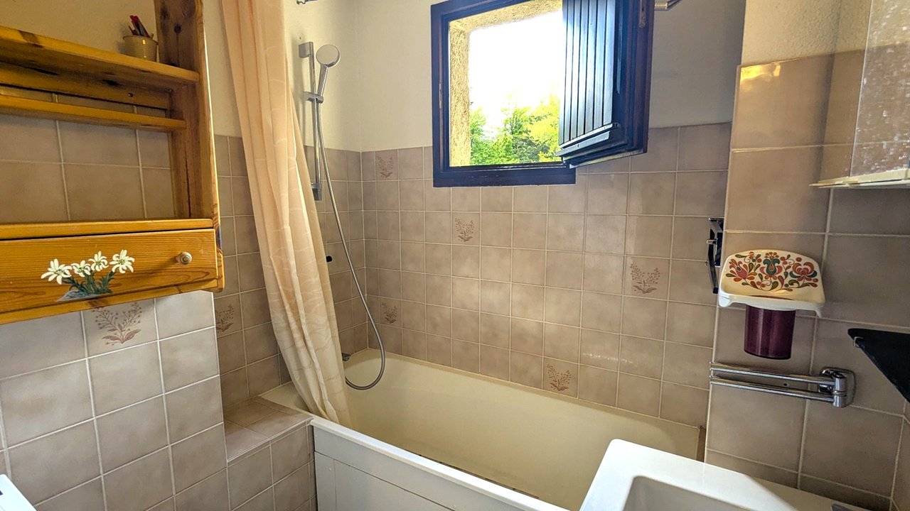 Il se compose d'une entrée avec placards, d'une chambre avec un lit double en 140x200, une commode et des étagères , une salle de bain avec baignoire, un WC séparé.