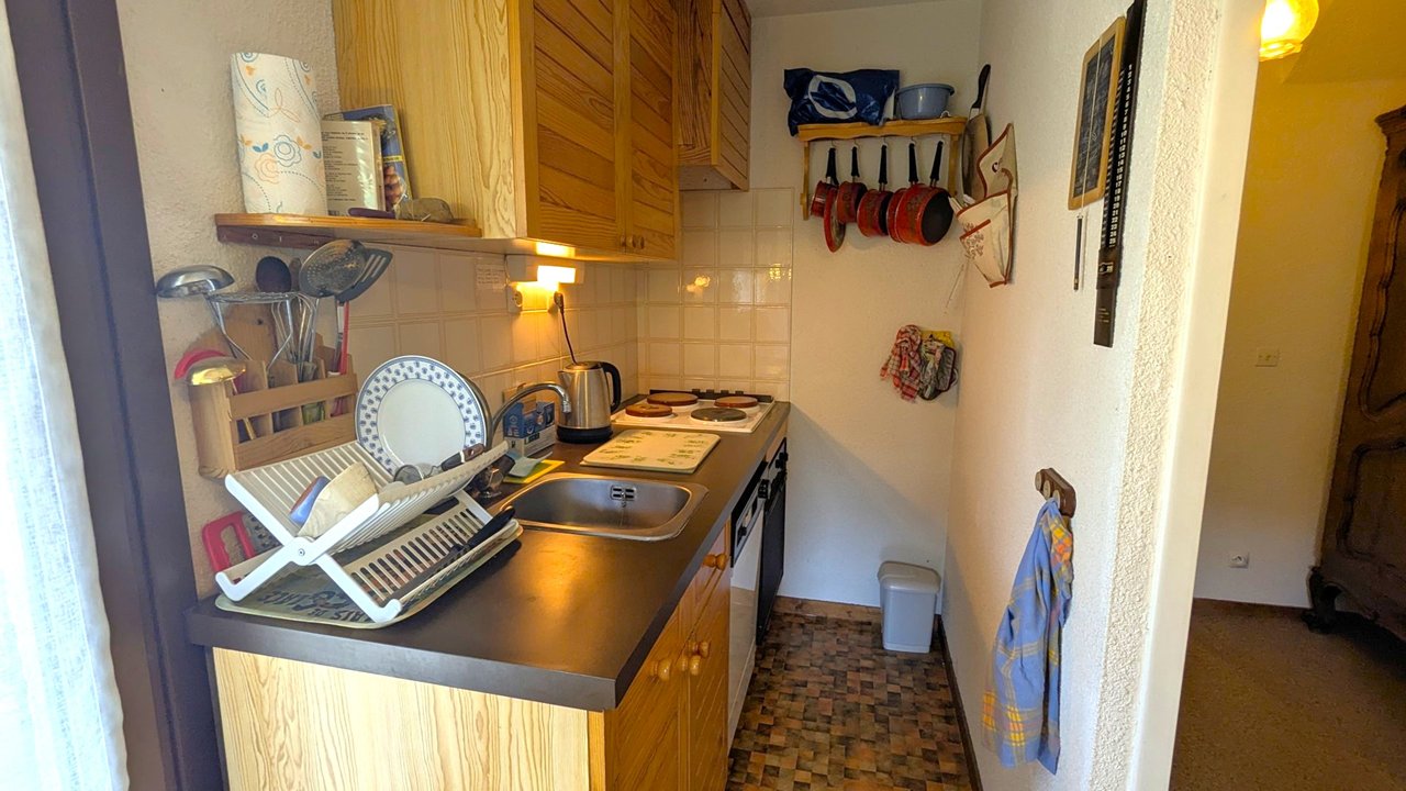 Le séjour avec un canapé-lit: 1 lit double 140x200, la cuisine est équipée d'un réfrigérateur avec freezer, four, cafetière à filtre, plaques électriques, lave-vaisselle, micro-onde...), dans le séjour une porte fenêtre qui donne accès à un balcon terrasse pour profiter d'un repas ou d'un moment détente au soleil exposition Sud-Ouest.