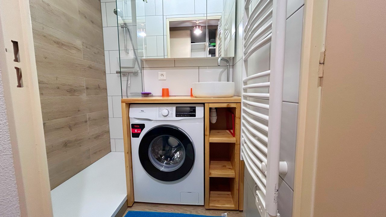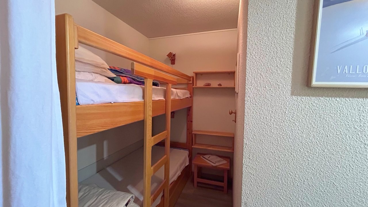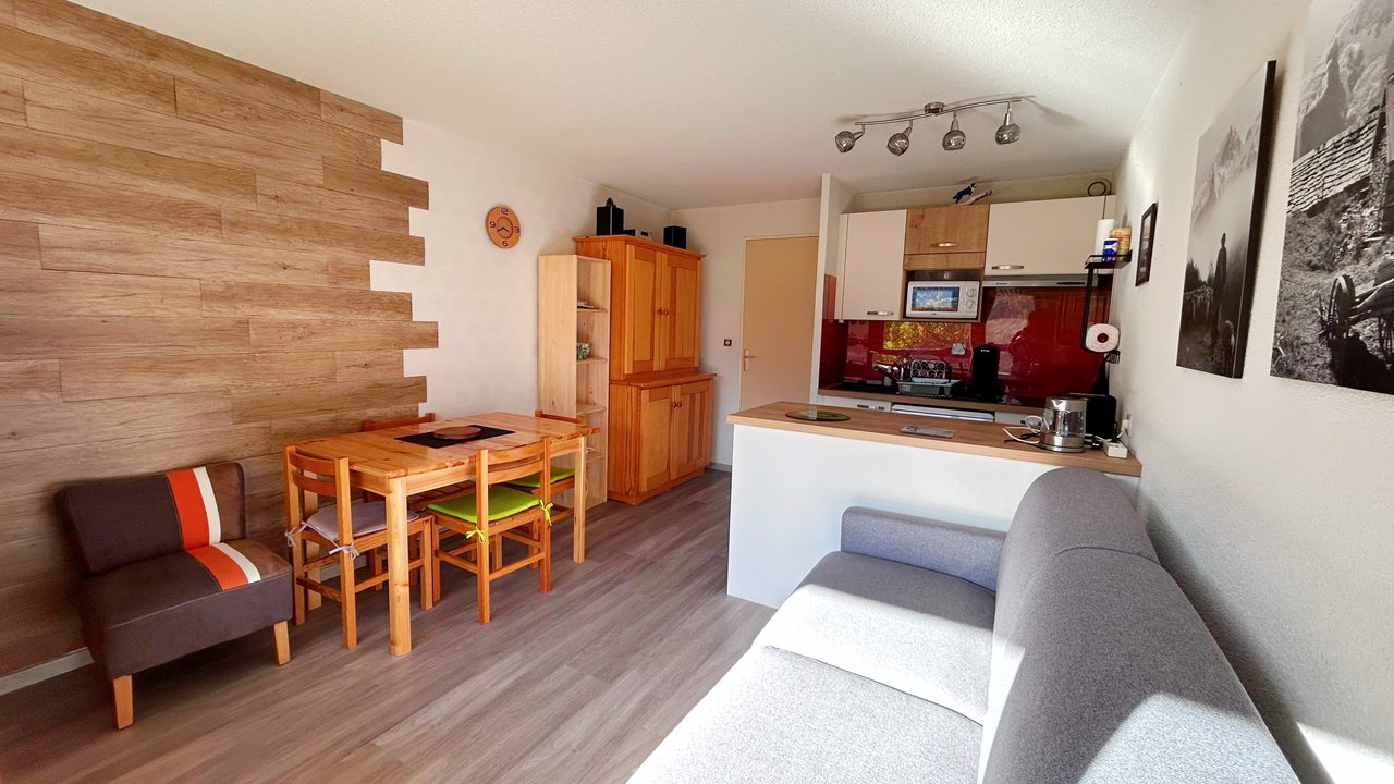 Appartement de montagne, 4 adultes et 2 enfants. Il se compose d'une entrée avec un grand placard, une chambre avec un lit double (140x200), d'un coin montagne avec un lit superposé séparé par un rideau( 90x200), une salle de bain avec grande douche et une machine à laver, un WC séparé. Le séjour avec un canapé clic clac deux places (140x200), la cuisine est équipée d'un réfrigérateur, four , micro-ondes, plaque vitro-céramique, lave-vaisselle... Un agréable balcon exposée plein SUD, pour profitez d'un repas ou d'un moment détente au soleil. Un parking se situe face à la résidence.