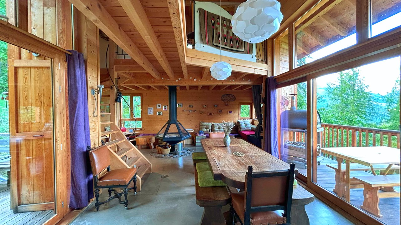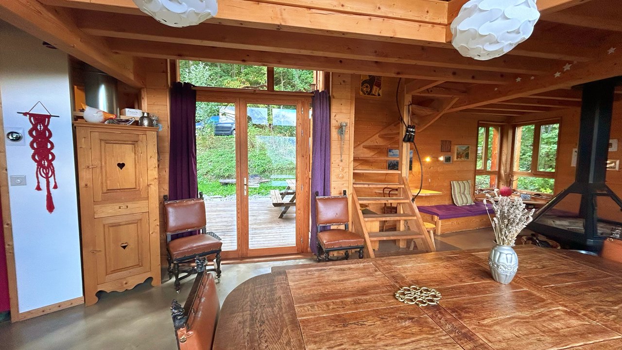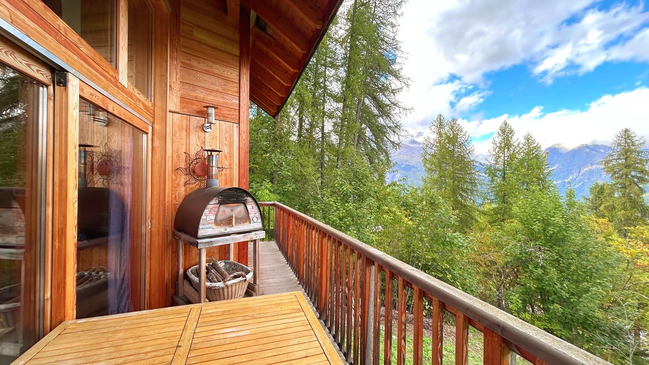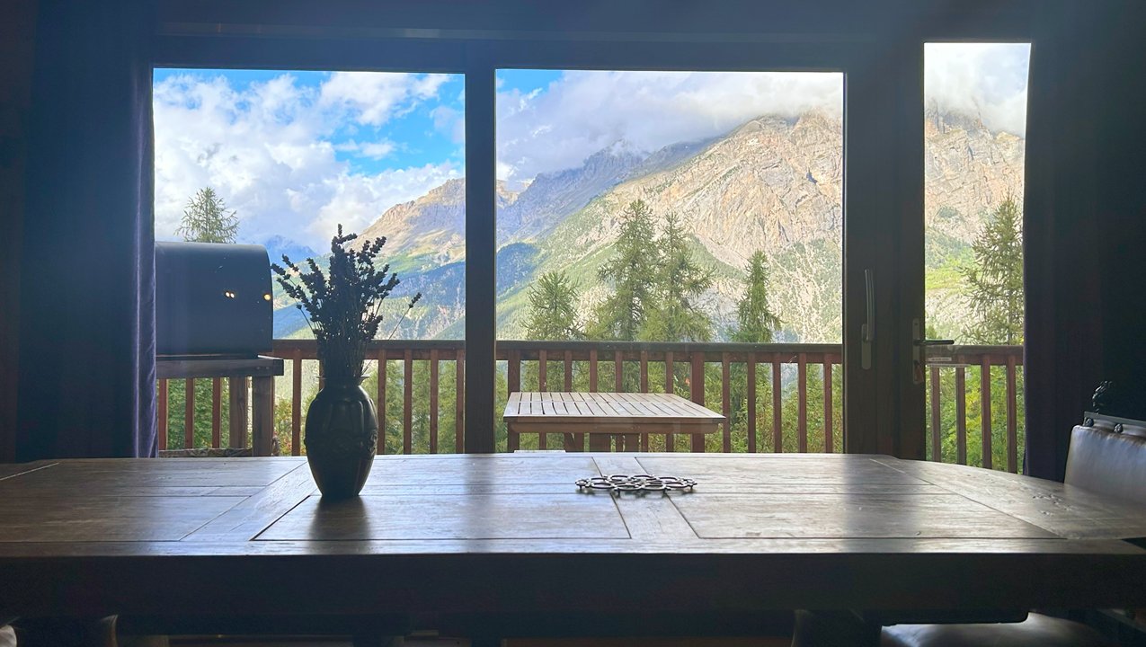 La grande pièce de vie, conviviale et lumineuse, réunit un vaste salon avec poêle suspendu, un espace salle à manger et une cuisine ouverte très bien équipée. Cette pièce donne directement sur un grand balcon orienté face à la vallée, aménagé avec une table, des chaises et un four à pizza, idéal pour partager des repas en extérieur. Côté entrée, une autre terrasse avec mobilier complète les espaces de détente.