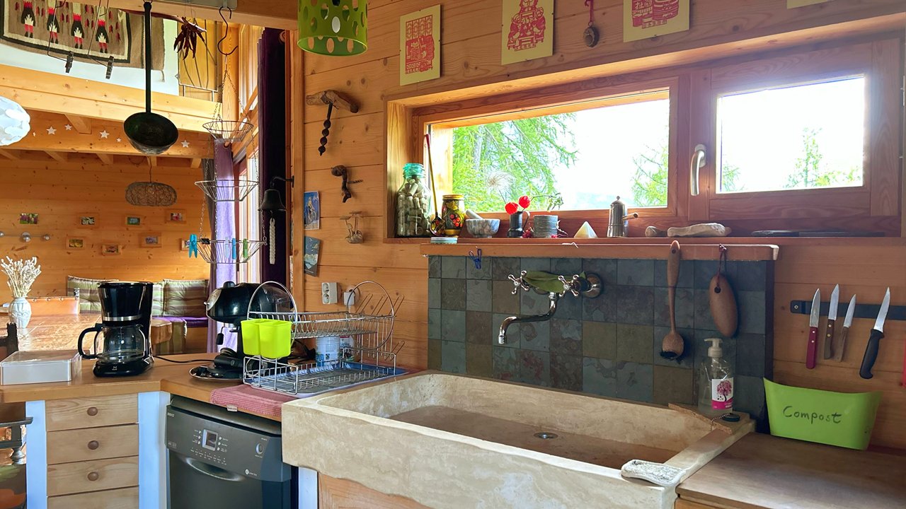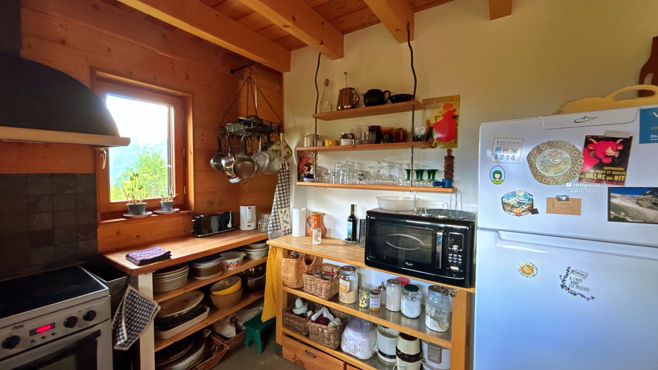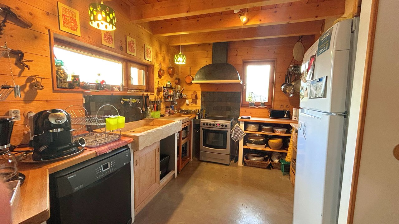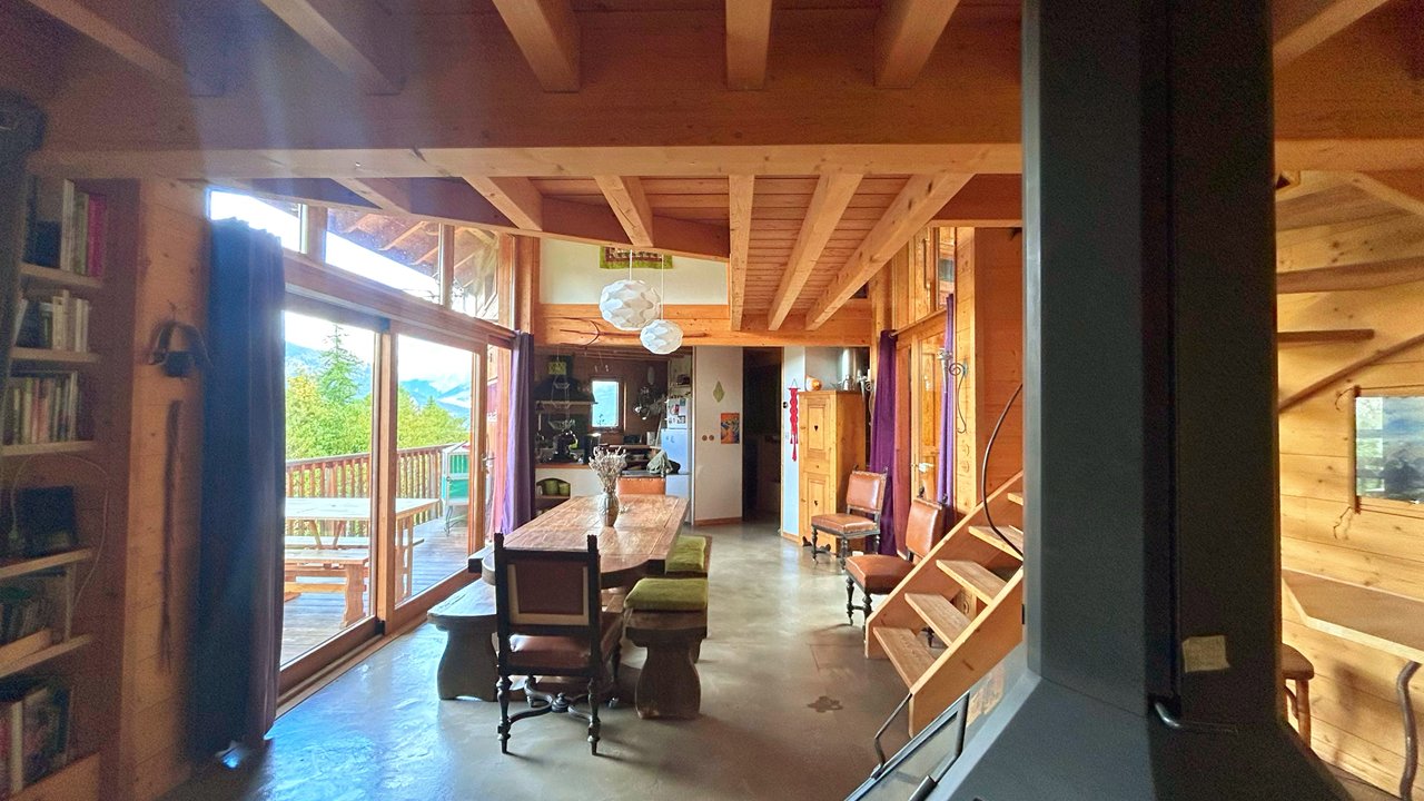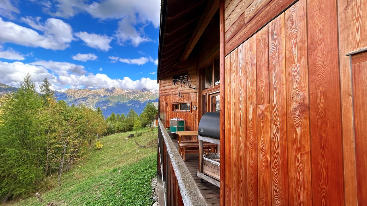 La grande pièce de vie, conviviale et lumineuse, réunit un vaste salon avec poêle suspendu, un espace salle à manger et une cuisine ouverte très bien équipée. Cette pièce donne directement sur un grand balcon orienté face à la vallée, aménagé avec une table, des chaises et un four à pizza, idéal pour partager des repas en extérieur. Côté entrée, une autre terrasse avec mobilier complète les espaces de détente.