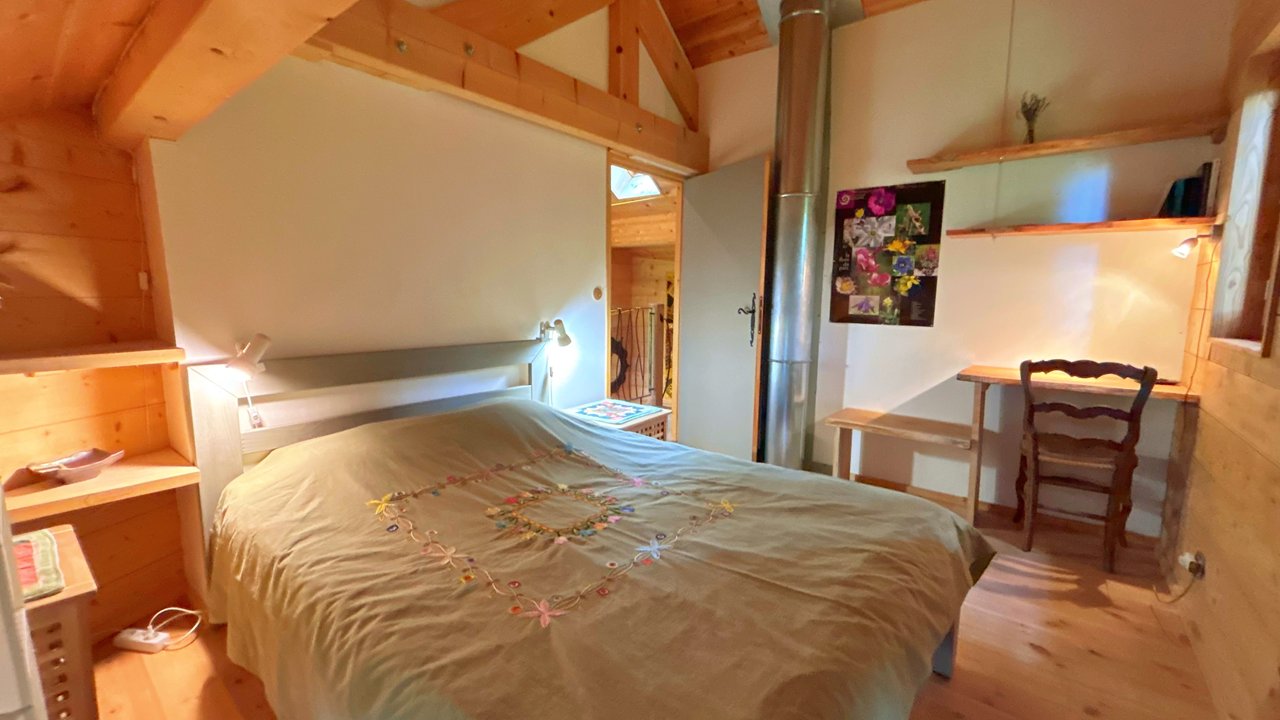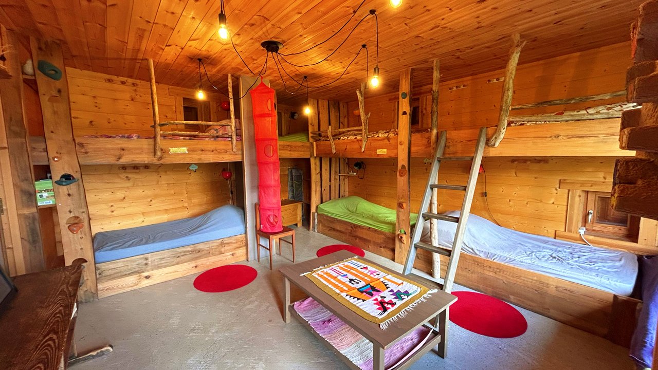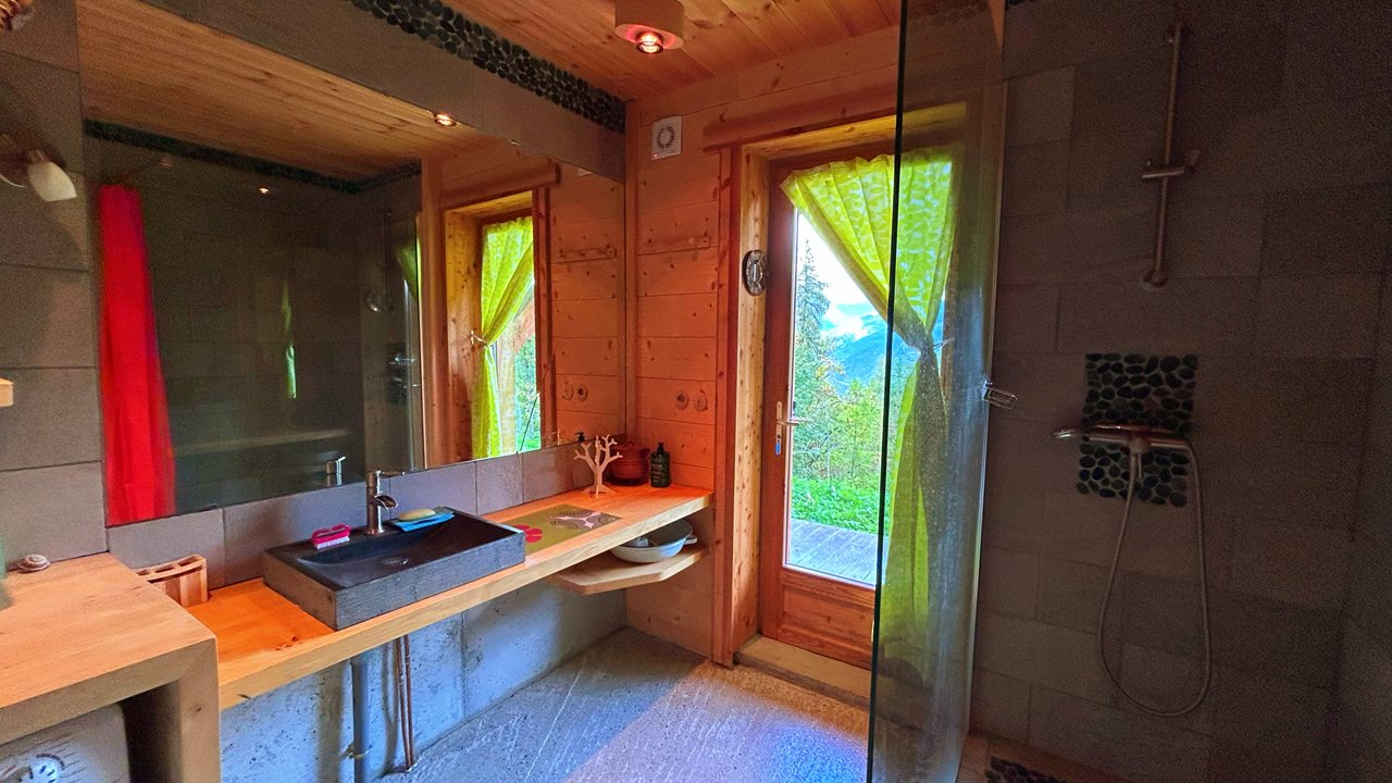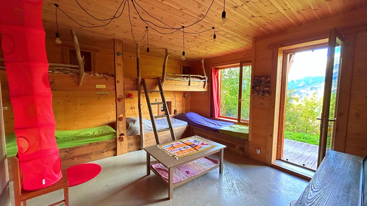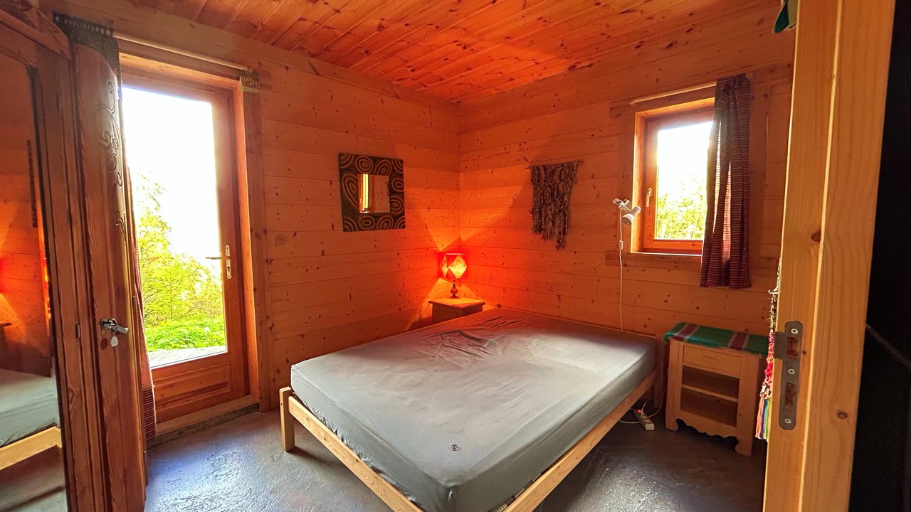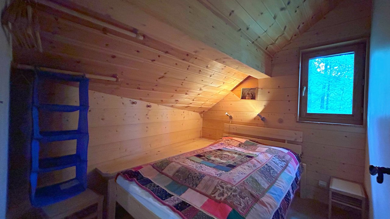 À l’étage inférieur, accessible depuis l’entrée, se trouvent une chambre double avec lit 160x200, une salle de douche avec machine à laver, un WC séparé et une grande chambre dortoir avec 4 lits simples (90x190). Pour des raisons de sécurité, seuls les lits du bas sont utilisés. Ces deux chambres disposent de portes vitrées donnant accès à une petite terrasse privative face à la vallée.
