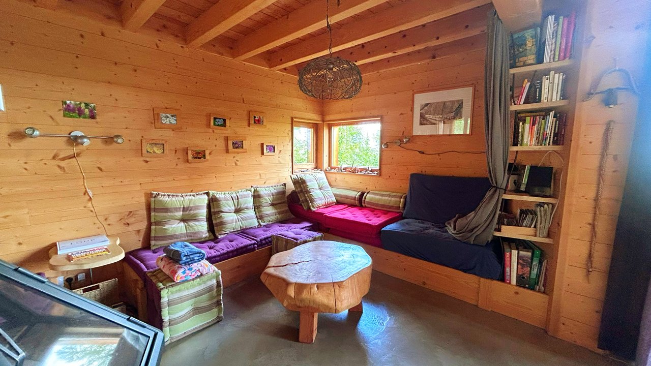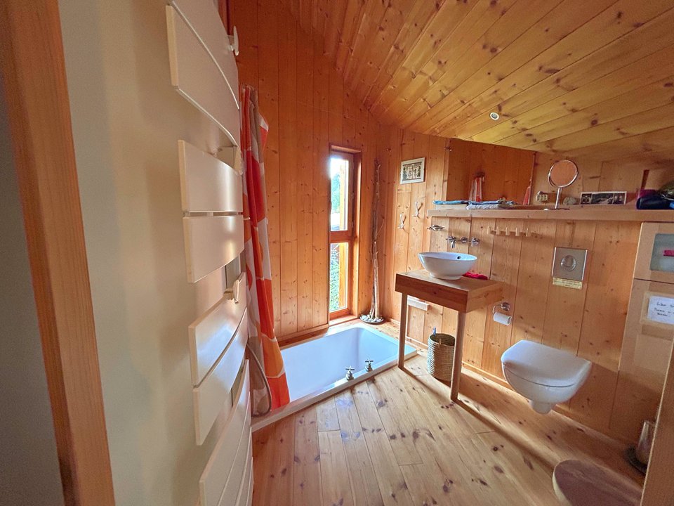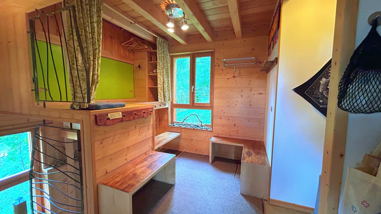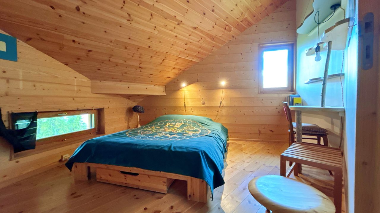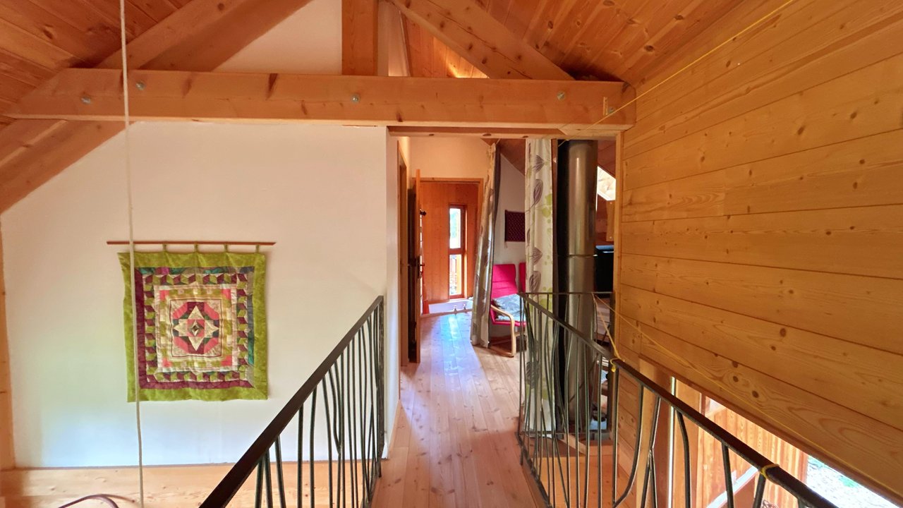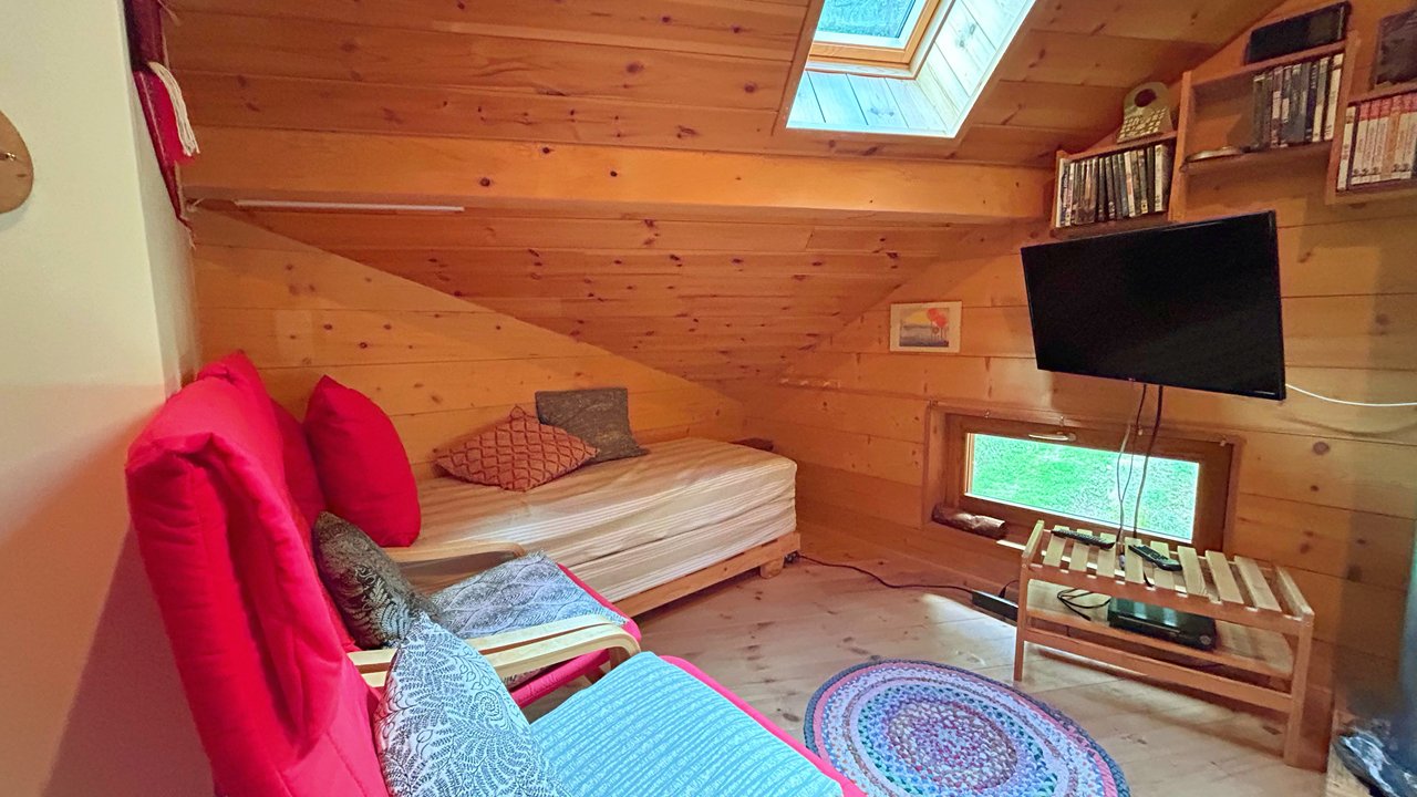 À l’étage inférieur, accessible depuis l’entrée, se trouvent une chambre double avec lit 160x200, une salle de douche avec machine à laver, un WC séparé et une grande chambre dortoir avec 4 lits simples (90x190). Pour des raisons de sécurité, seuls les lits du bas sont utilisés. Ces deux chambres disposent de portes vitrées donnant accès à une petite terrasse privative face à la vallée.