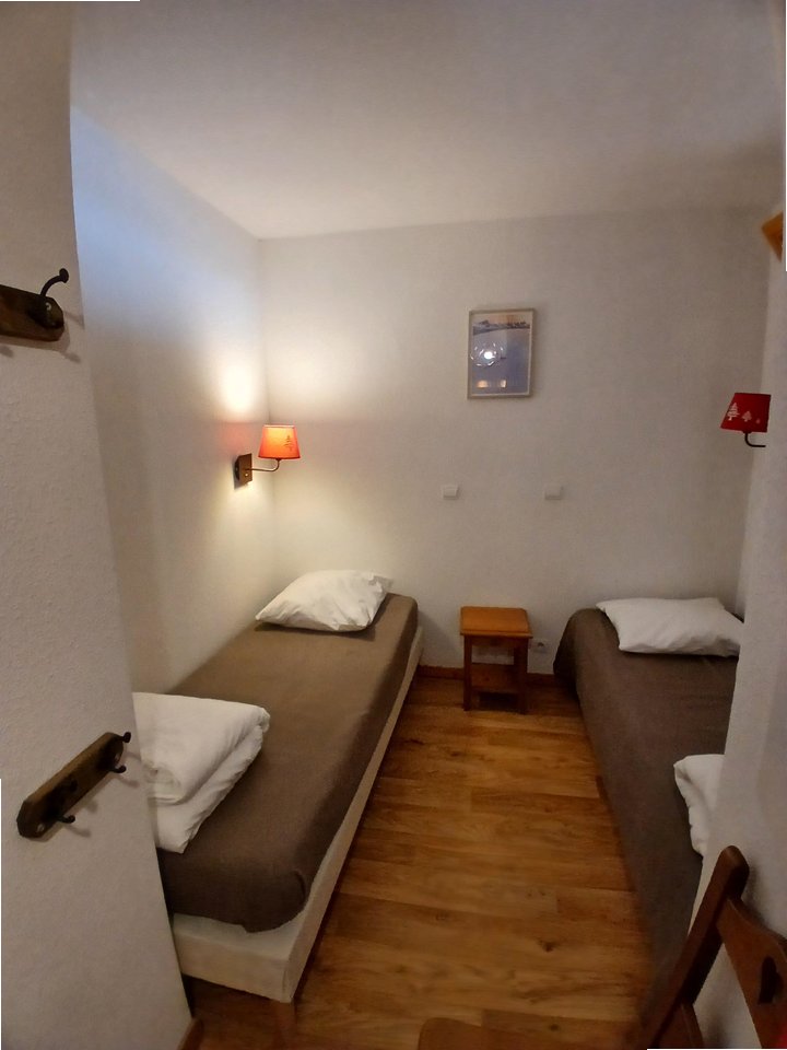 - Couchages : une chambre avec lit double neuf (160x200), une chambre cabine avec deux lits simples (80x190) et étagères de rangement. Lits équipés de couettes et oreillers.