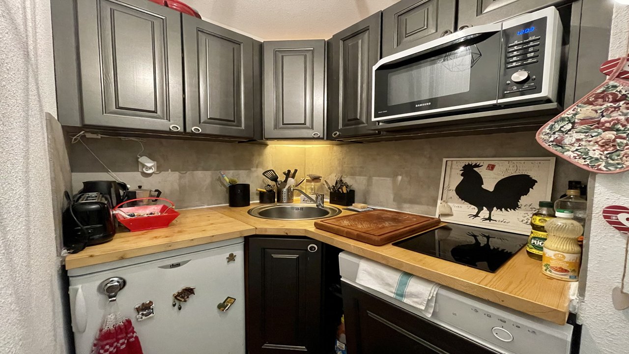 - Cuisine équipée : avec micro-ondes, lave-vaisselle, 4 plaques vitrocéramiques, réfrigérateur, grille-pain, bouilloire, cafetière.