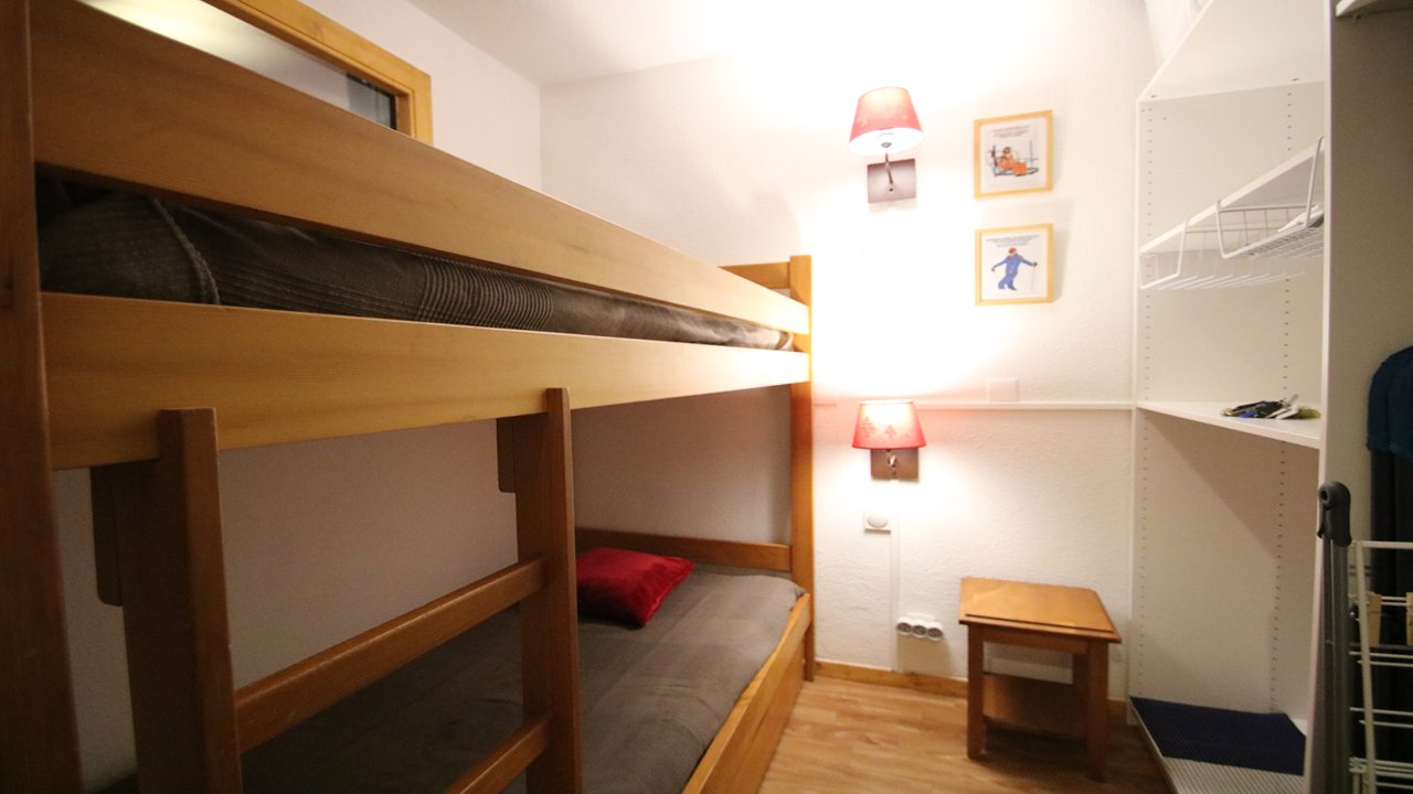 - Couchages : une chambre avec lit double (matelas neuf 140x190), une chambre cabine avec lits superposés (matelas neufs 90x190) et étagères de rangement. Lits équipés de couettes et oreillers 60x60.