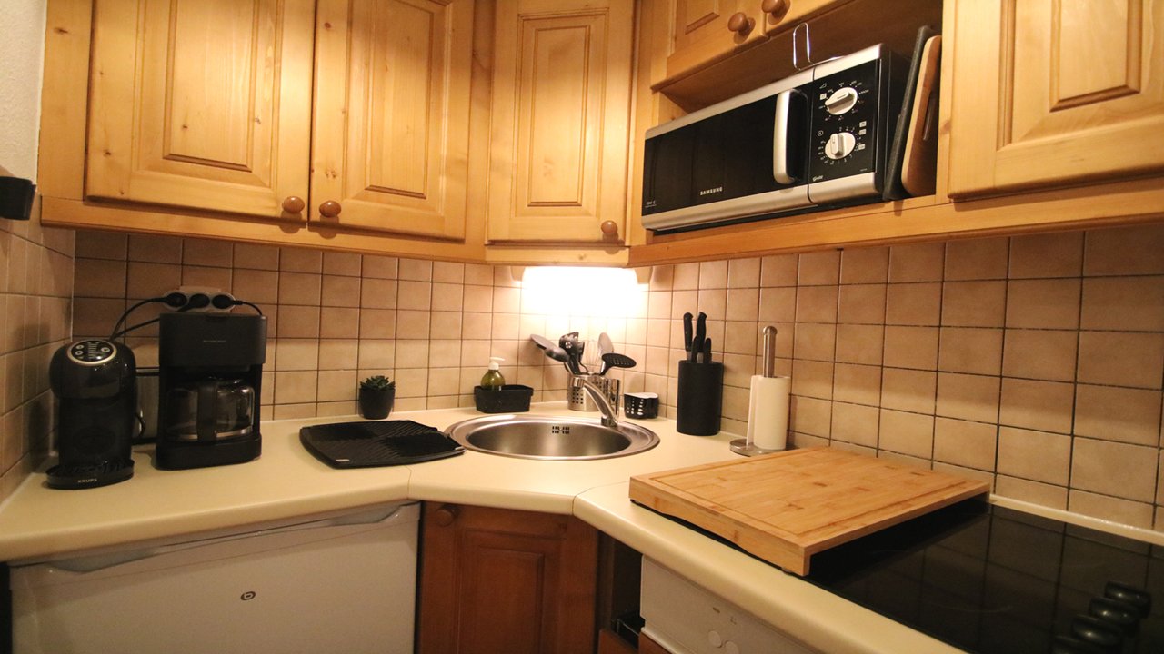 - Cuisine équipée : avec micro-ondes, lave-vaisselle, plaque de cuisson vitrocéramique, réfrigérateur, grille-pain, bouilloire, cafetière, agrémentée de nombreux ustensiles et bacs de rangement.
