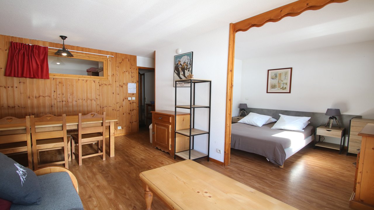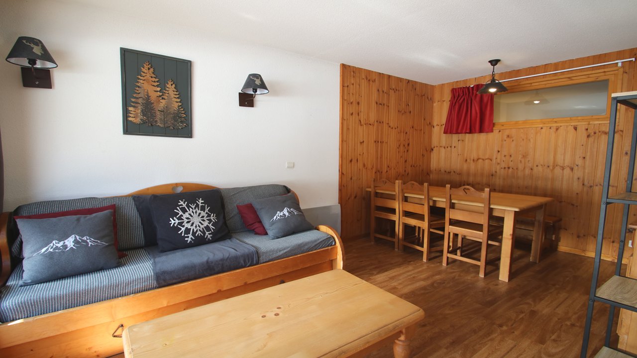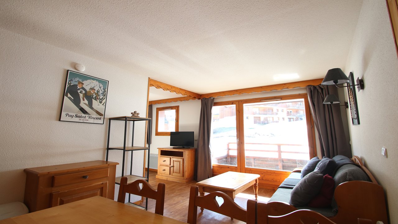 - Séjour avec canapé lit gigogne convertible (2/80x190 ou 160x190), table à manger, tv écran plat et balcon équipé d’une table et deux chaises.
