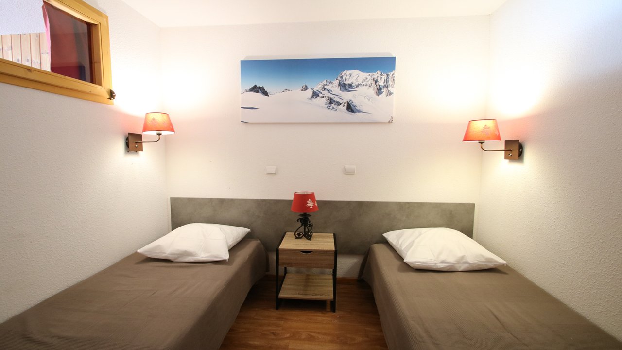 - Couchages : une chambre avec lit double (140x190), une chambre cabine avec deux lits simples (80x190) et étagères de rangement. Lits équipés de couettes et oreillers 60x60.