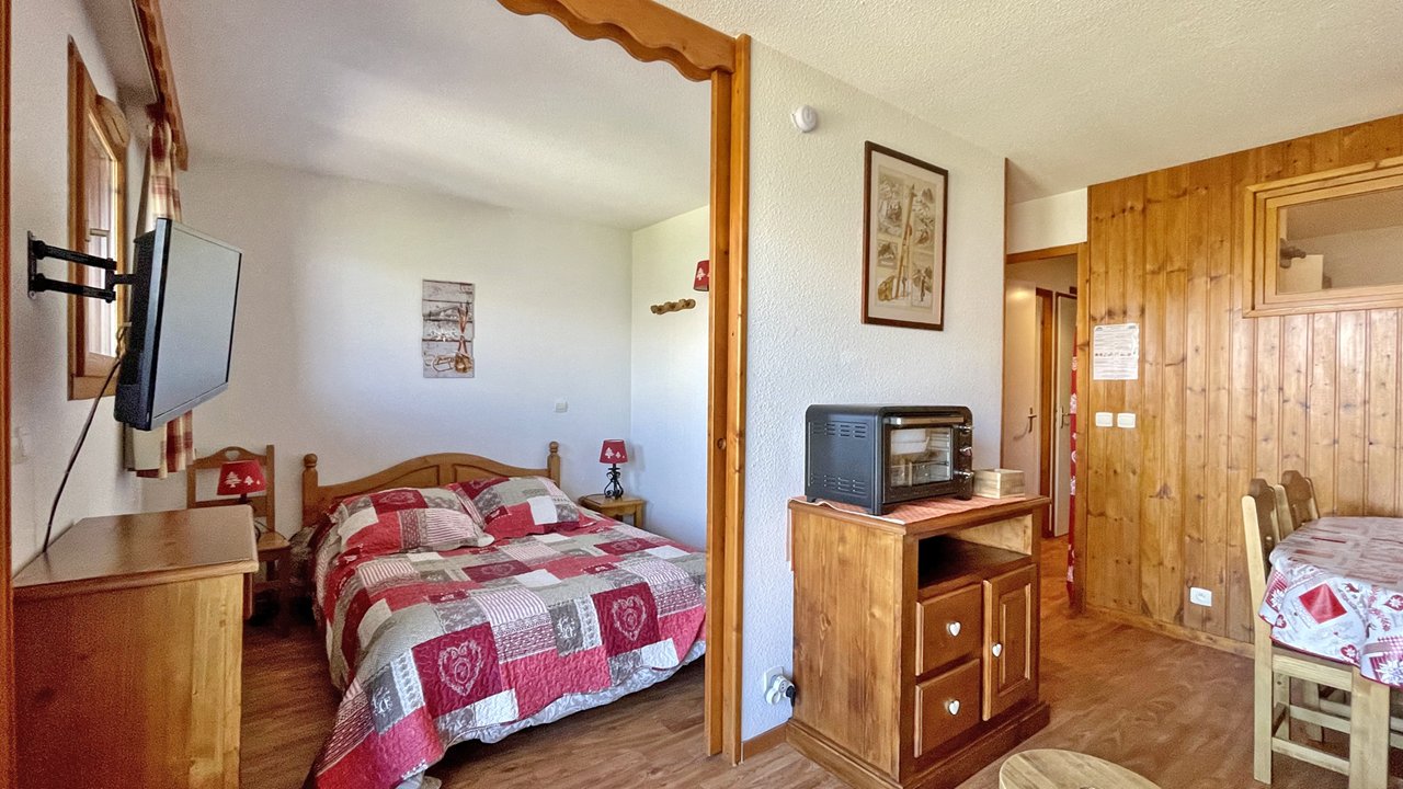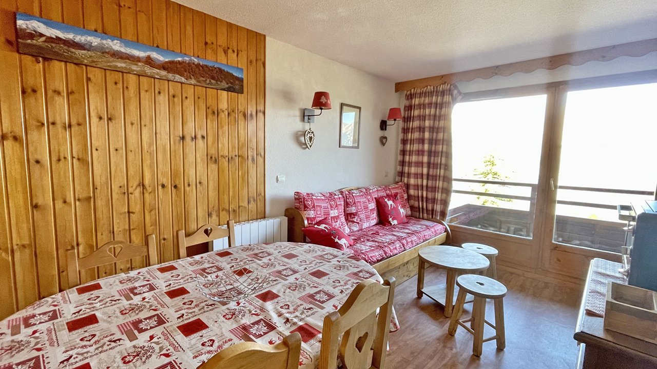 - Séjour avec canapé lit gigogne convertible (2/80x190 ou 160x190), table à manger, tv écran plat et balcon équipé d’une table et deux chaises.