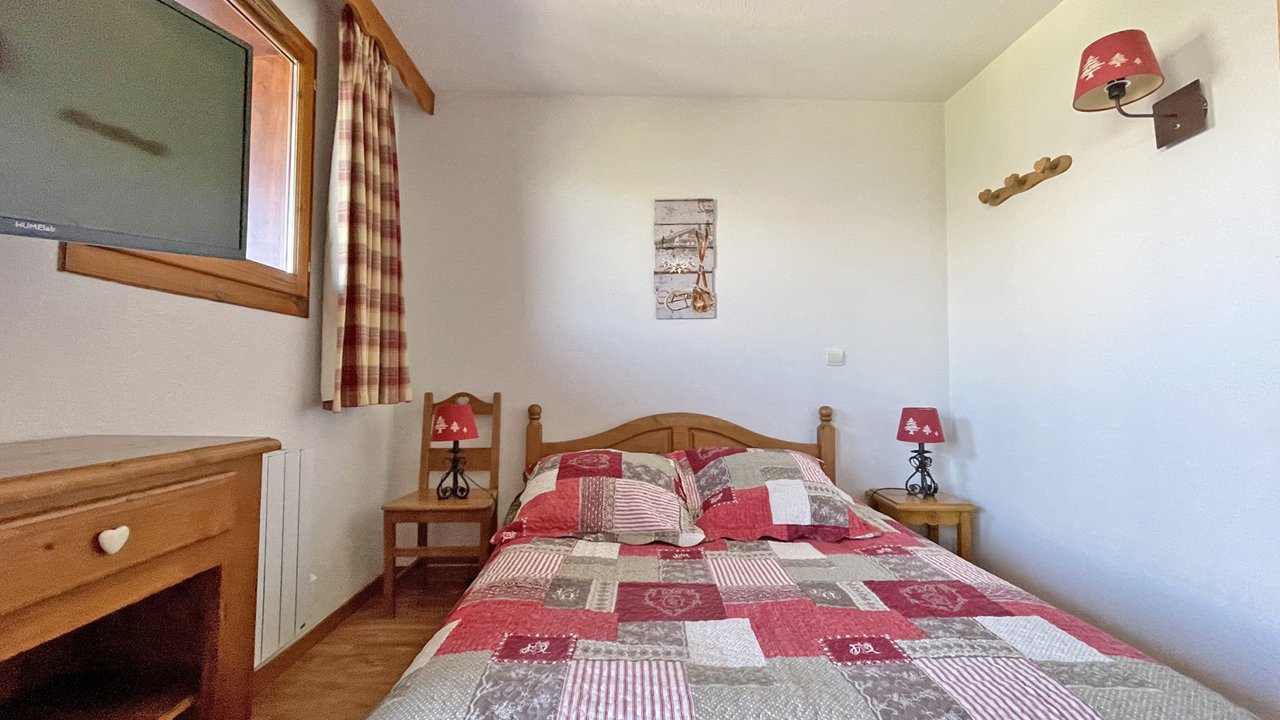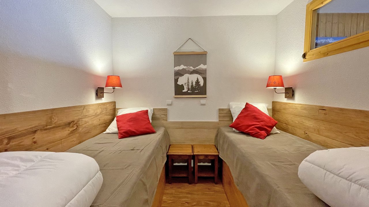 - Couchages : une chambre avec lit double (140x190), une chambre cabine avec deux lits simples (80x190) et étagères de rangement. Lits équipés de couettes et oreillers 60x60.