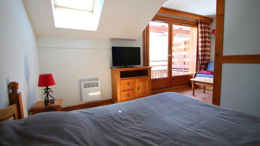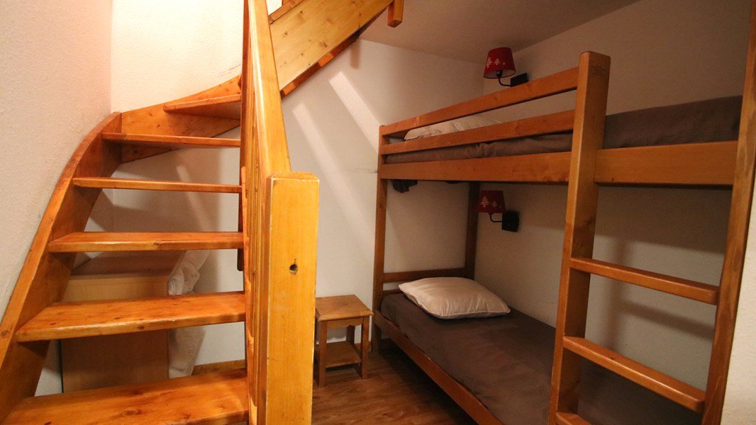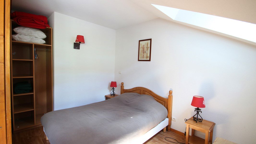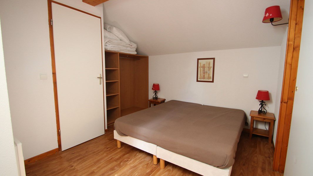 - Couchages : Une chambre avec lit double neuf (160x200), un coin montagne avec lits superposés (80x190) et étagères de rangement et une chambre à l'étage avec 2 lits simples accolés (2/80x190 ou 160x190) et salle de douche + WC attenants.
