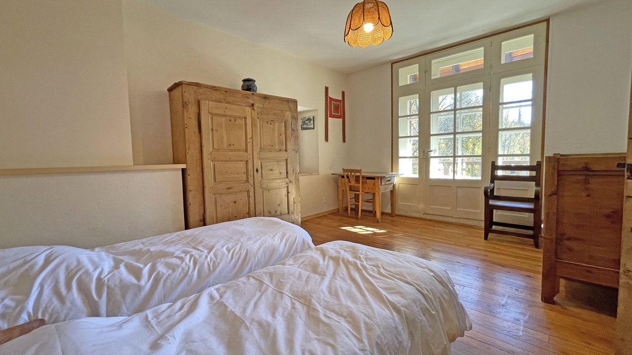 La maison du XVIIème siècle a gardé son caractère authentique. Elle est entourée de balcons sur 3 façades. L’appartement loué est totalement indépendant au 1er étage, il a 2 accès autonomes, l'un côté jardin, l'autre côté chemin.