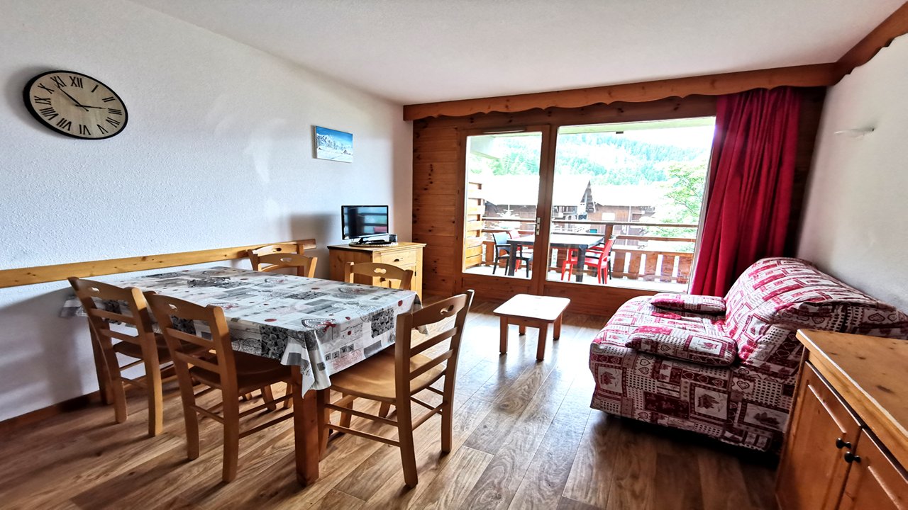 - Séjour avec un canapé BZ, terrasse exposée sud-ouest.